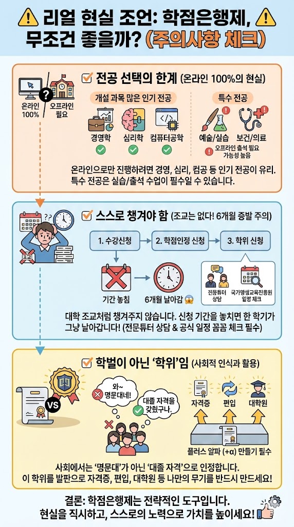 ✔️ 학벌이 아닌 '학위'임: "나 학점은행제로 대학 나왔어"라고 했을 때 사회에서 "와~ 명문대네"라고 하지 않습니다. "대졸 자격을 갖췄구나"라고 인정할 뿐입니다. 그러니 이 학위를 발판으로 자격증, 편입, 대학원 등 '플러스 알파'를 반드시 만들어야 합니다.