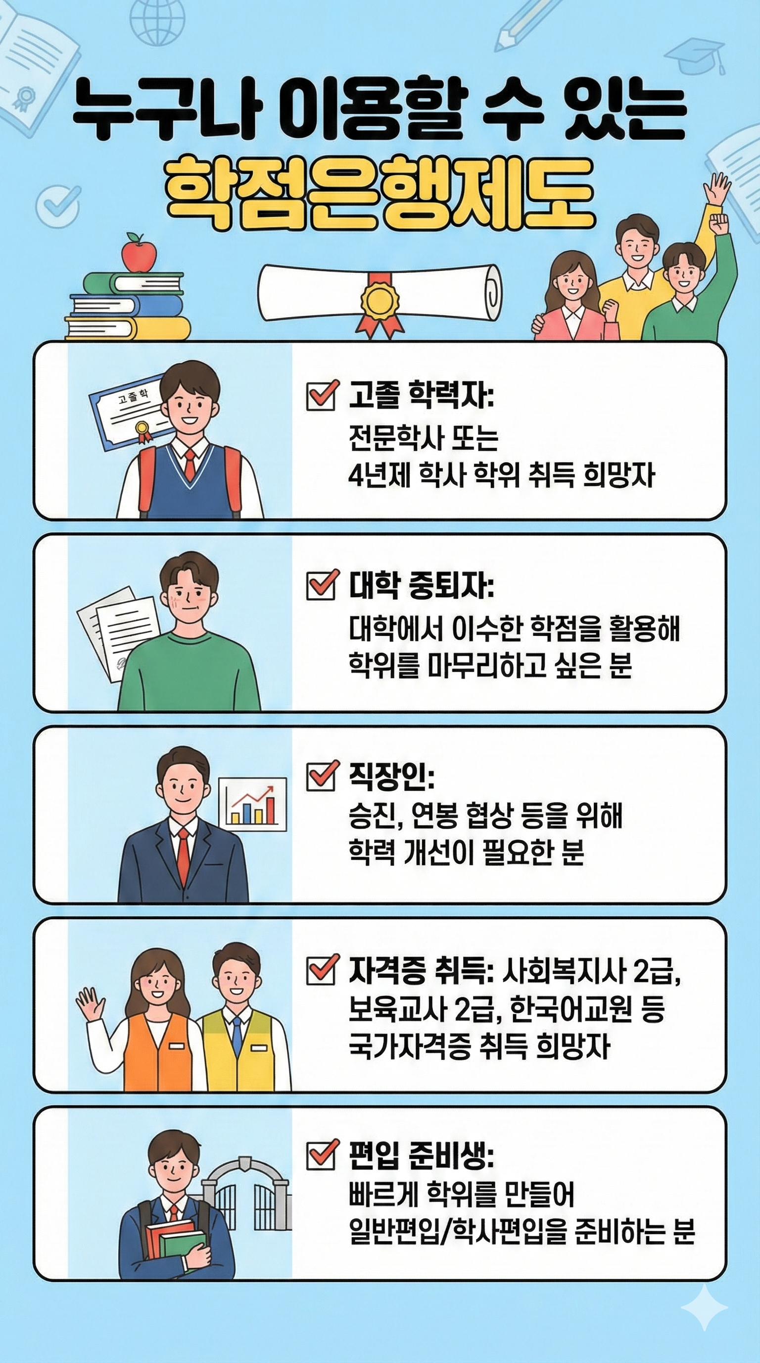 ✔️ 대학 중퇴자: 대학에서 이수한 학점을 활용해 학위를 마무리하고 싶은 분