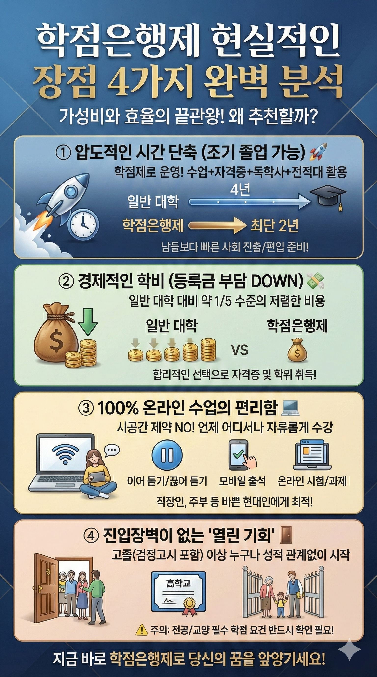 이를 잘 활용하면 4년제 학사를 최단 1년 6개월~2년 만에 취득하는 것도 가능합니다. 남들보다 빠르게 사회에 진출하거나 상위권 대학 편입을 준비할 수 있다는 것이 가장 큰 무기입니다.