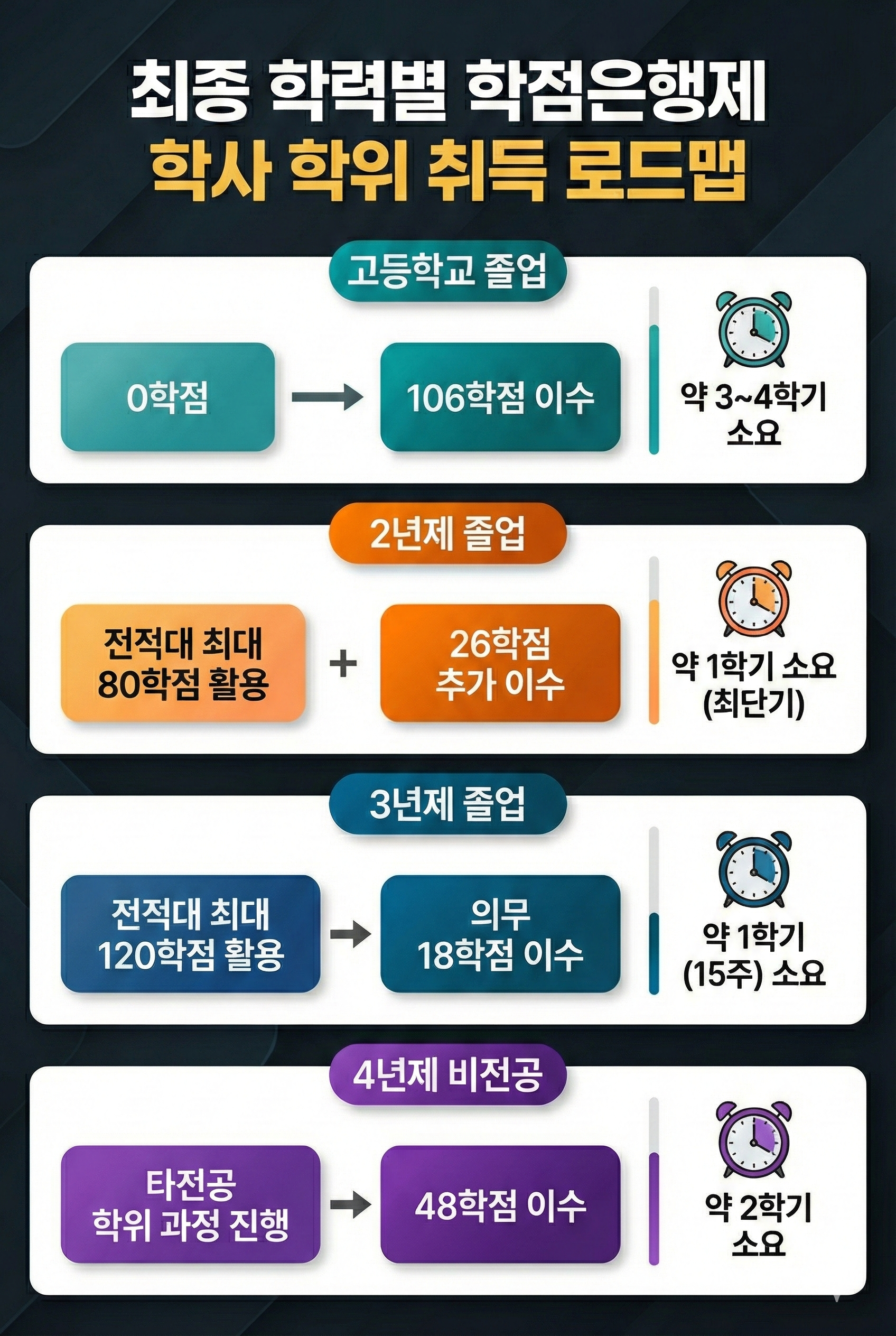 💡 전문가의 Tip: 2년제나 3년제 졸업자는 대학에서 이수한 학점을 그대로 가져올 수 있어(전적대 학점), 부족한 학점만 채우면 4개월(1학기) 만에도 응시 자격을 완성할 수 있습니다.