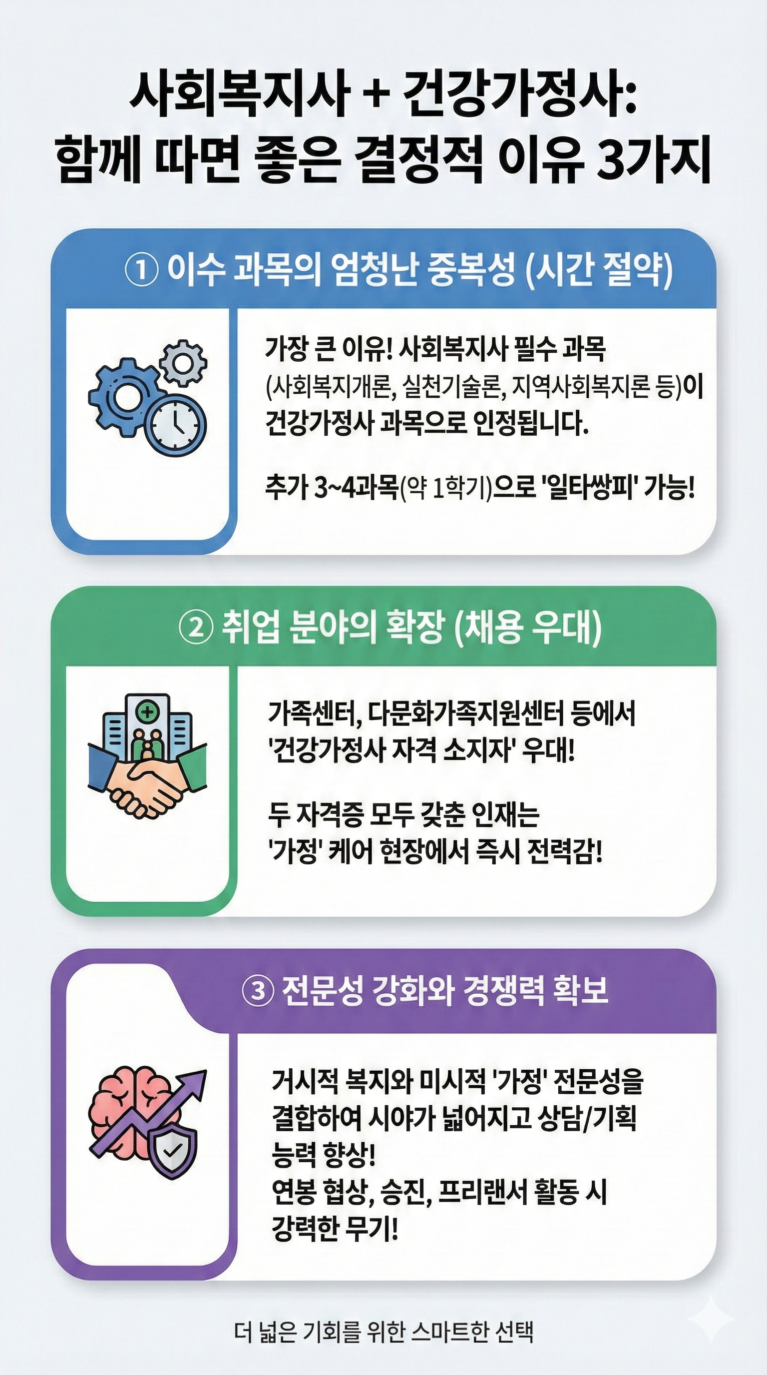 사회복지 분야는 결국 '가정'을 단위로 케어하는 경우가 많기 때문에, 두 자격증을 모두 갖춘 인재는 현장에서 즉시 전력감으로 인정받습니다.