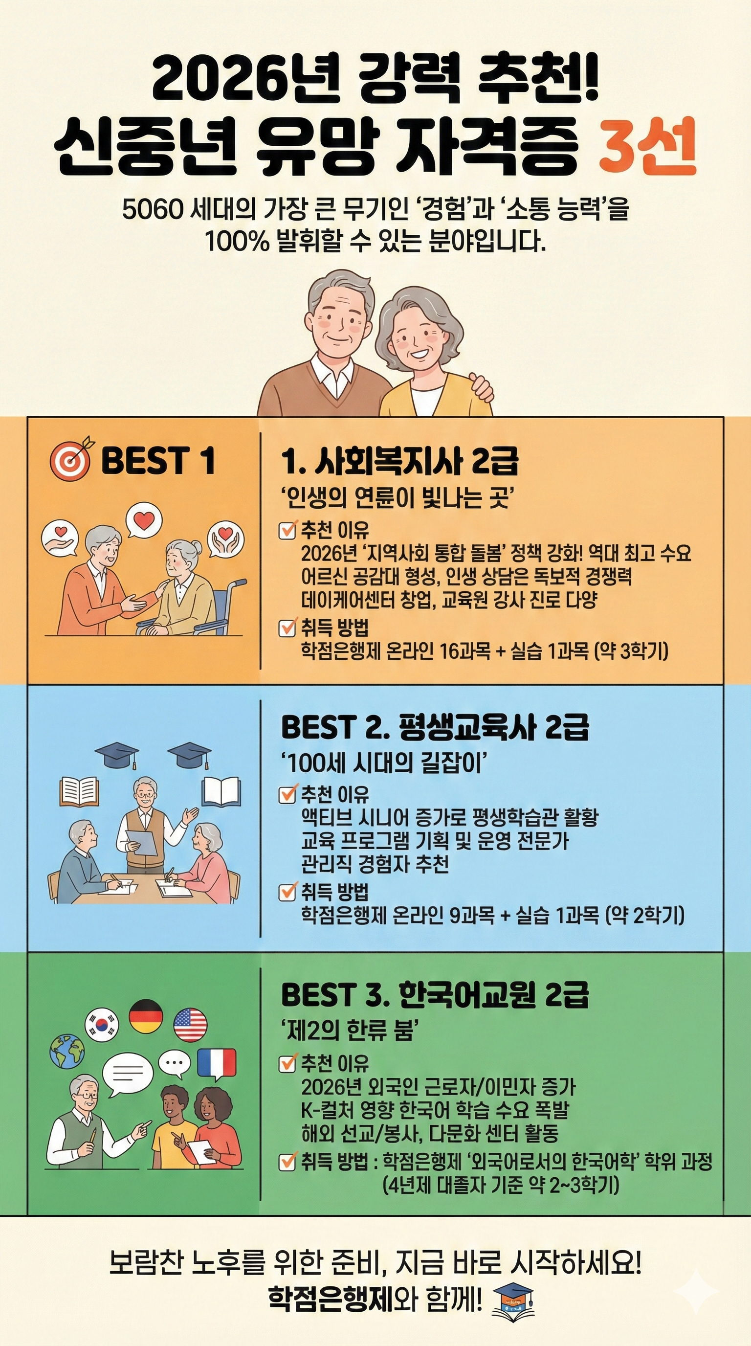 #5060재취업 #신중년일자리 #은퇴후직업 #노후대비자격증 #학점은행제 #사회복지사2급 #평생교육사2급 #한국어교원2급 #공인중개사전망 #중장년자격증 #50대자격증 #60대재취업 #평생교육 #학은제 #주부자격증 #퇴직후진로 #액티브시니어 #인생이모작 #국가자격증추천 #미래유망직업