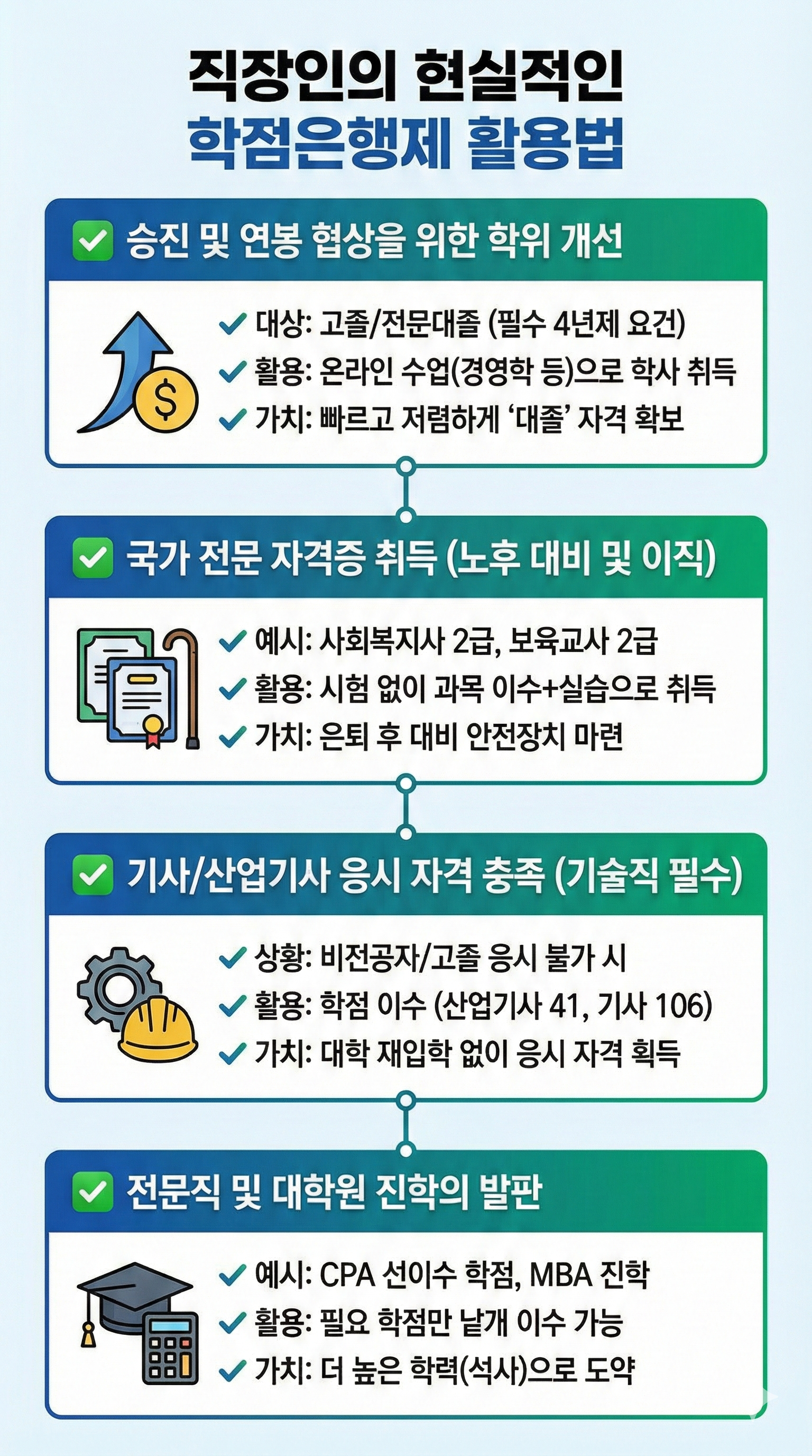 직장인에게 학점은행제는 '학벌 세탁'보다는 '자격 요건 충족'과 '커리어 확장의 도구'로서 접근할 때 가장 가성비가 높습니다.