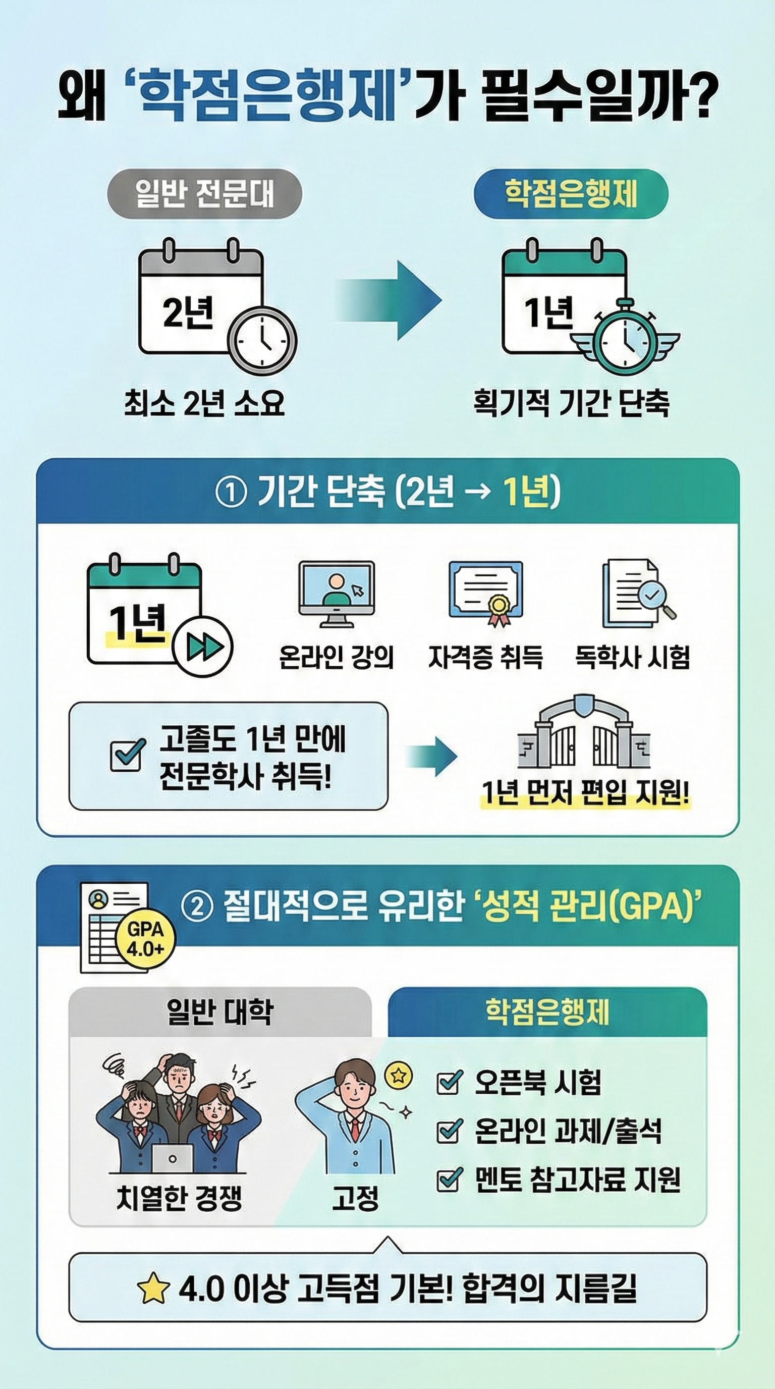 학점은행제를 똑똑하게 활용해 1년이라는 시간을 벌고, 남들보다 유리한 위치에서 합격의 기쁨을 누리시길 바랍니다.