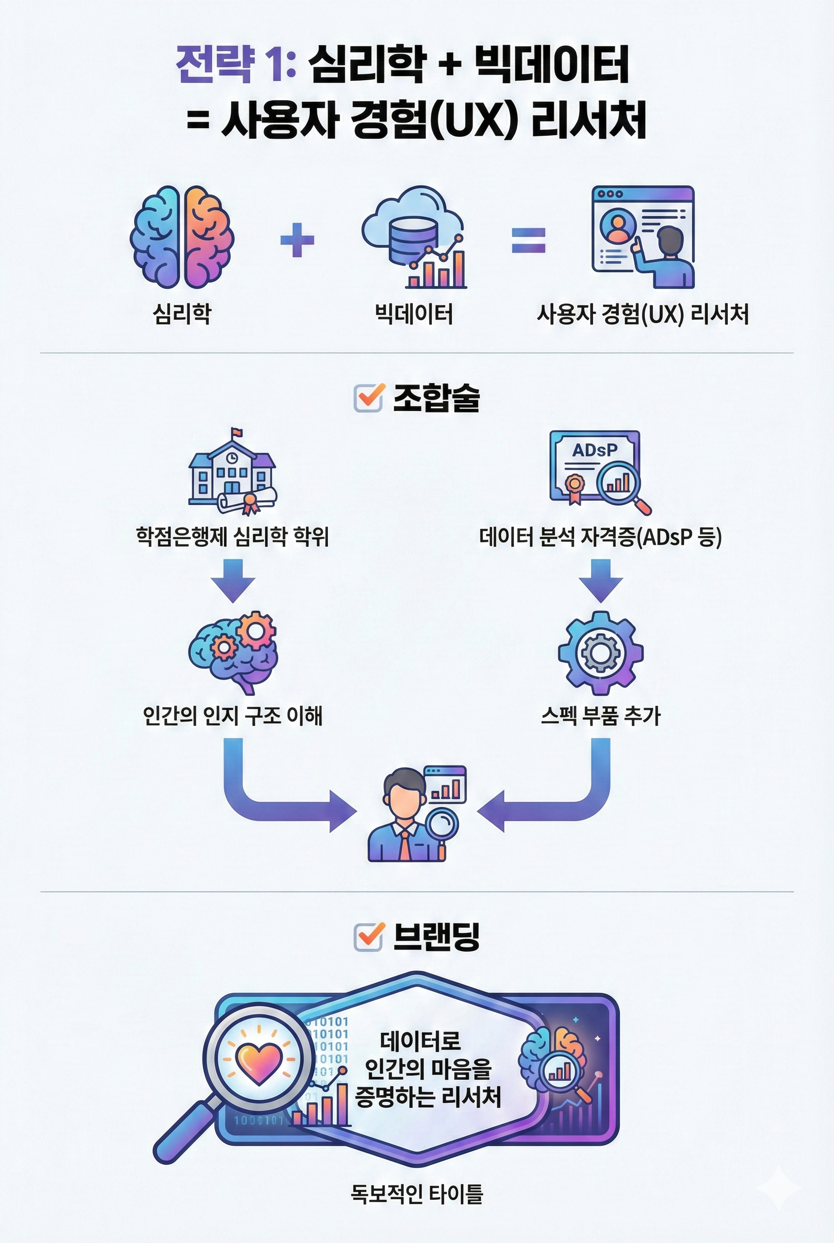 ✔️ 조합술: 학점은행제로 심리학 전공 학위를 취득하여 인간의 인지 구조를 이해합니다. 여기에 데이터 분석 자격증(ADsP 등)을 스펙 부품으로 추가합니다.