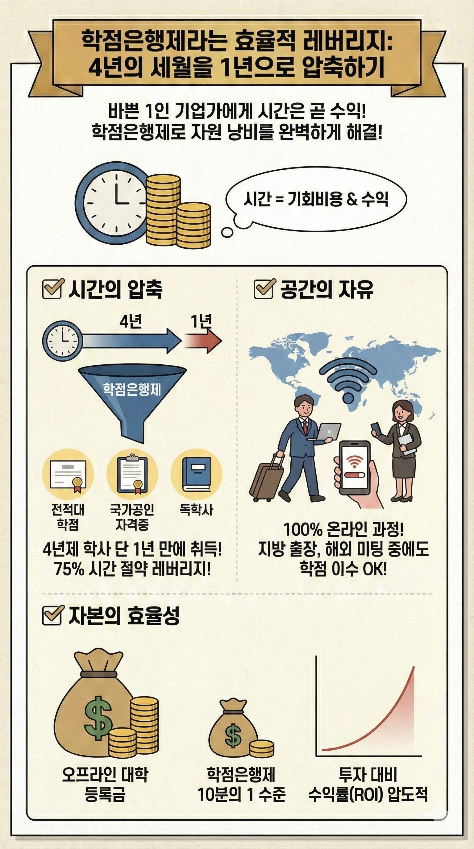 ✔️ 시간의 압축: 전적대 학점, 국가공인 자격증, 독학사 등을 전략적으로 조합하면 4년제 학사 학위를 단 1년에서 1년 반 만에 취득할 수 있습니다. 이는 75% 이상의 시간을 절약하는 엄청난 레버리지입니다.