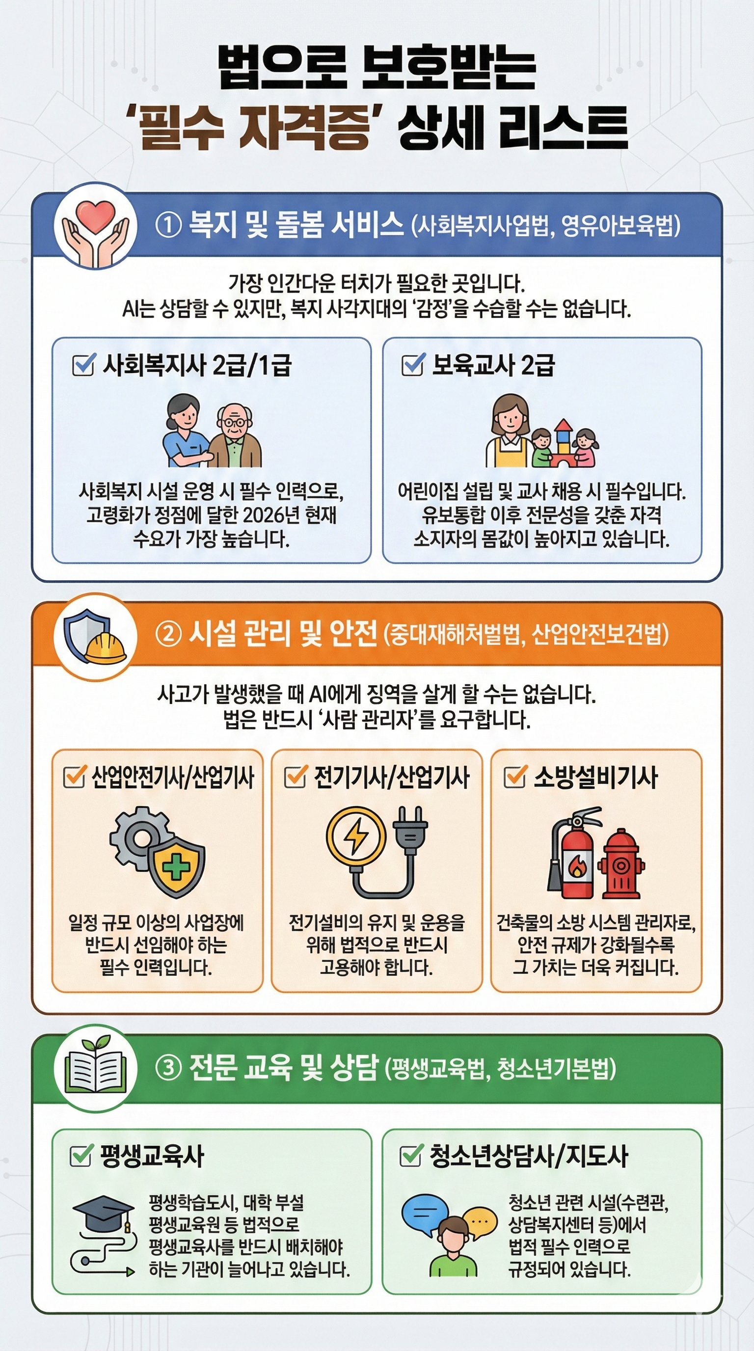 #AI대체불가능직업 #2026년유망자격증 #법정선임자격증 #학점은행제 #사회복지사2급 #보육교사2급 #산업안전기사 #전기기사 #소방설비기사 #평생교육사 #청소년상담사 #응시자격자가진단 #비전공자기사취득 #국가기술자격증 #직장인자기계발 #노후대비자격증 #재취업준비 #중대재해처벌법 #안전관리자선임 #미래유망직종