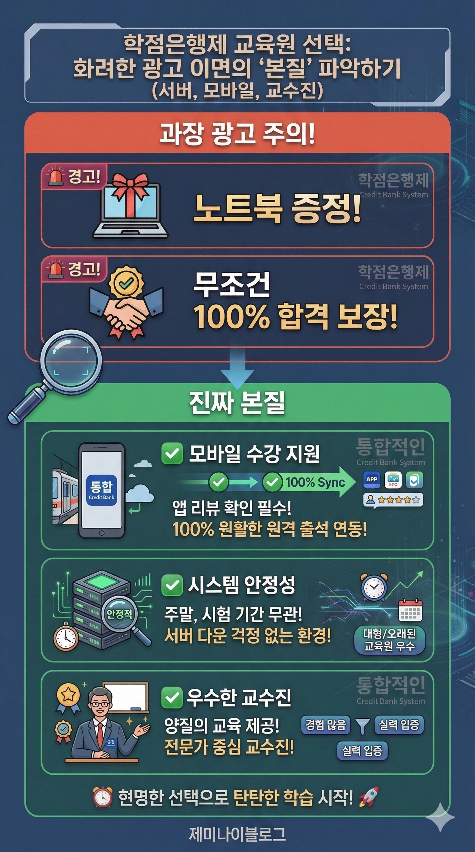 여기서 화려한 마케팅이나 당장 쥐여주는 사은품에 현혹되기보다는, 안정적인 시스템과 수준 높은 강의라는 교육 기관의 본질에 집중하여 옥석을 가려내는 안목이 필요합니다.
