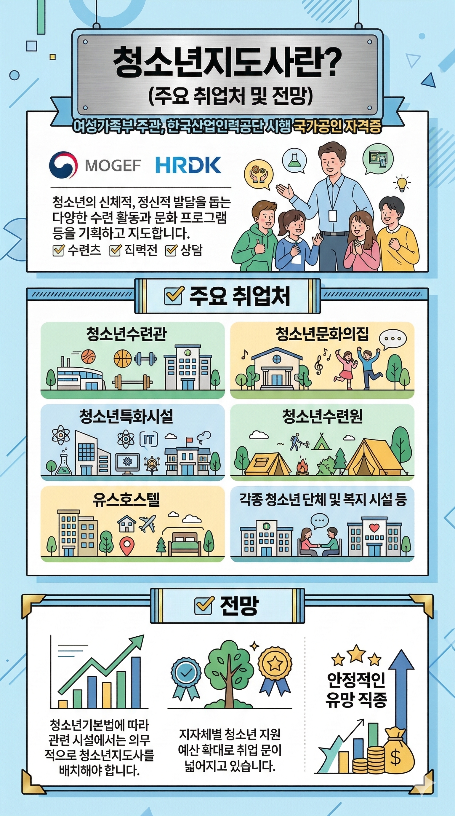 ✔️ 전망: 청소년기본법에 따라 관련 시설에서는 의무적으로 청소년지도사를 배치해야 합니다. 또한 지자체별로 청소년 지원 예산이 확대되면서 취업의 문은 더욱 넓어지고 있는 안정적인 유망 직종입니다.