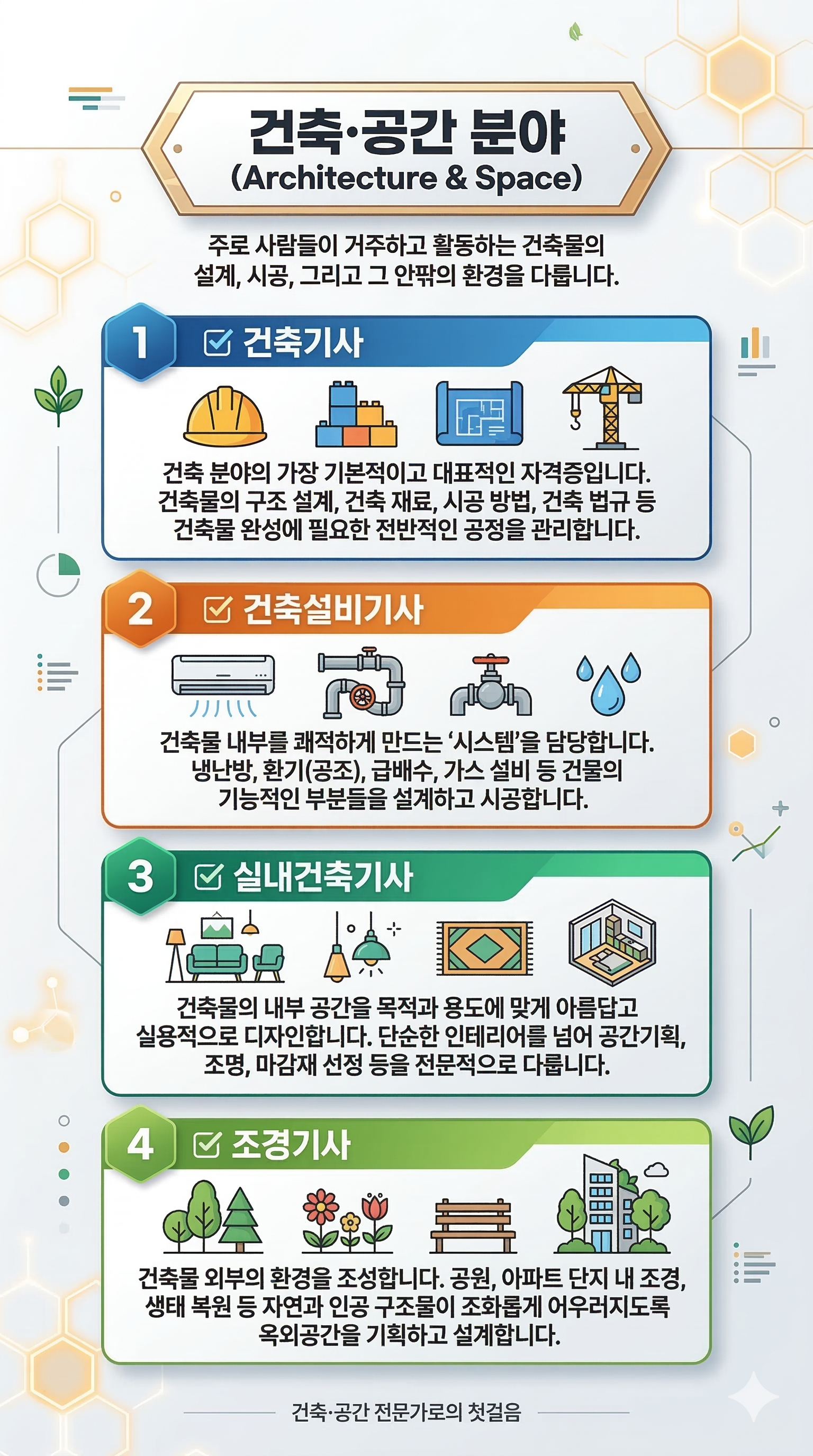 건설 분야의 기사 자격증은 우리가 생활하는 공간(건축물)과 그 토대가 되는 기반 시설(인프라)을 기획, 설계, 시공, 유지 및 관리하는 데 필요한 전문 지식을 검증하는 국가기술자격입니다.