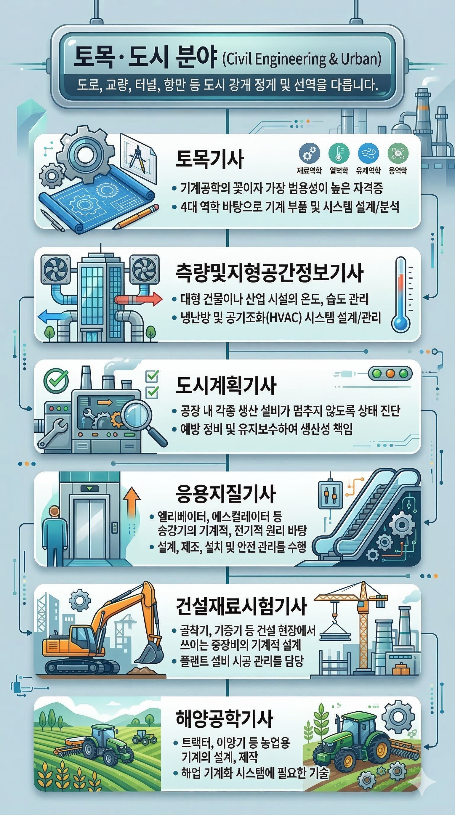 ✔️ 철도토목기사: 기차가 달리는 궤도, 철도 교량, 철도 터널 등 철도 인프라 건설과 유지보수에 특화된 지식을 다룹니다.
