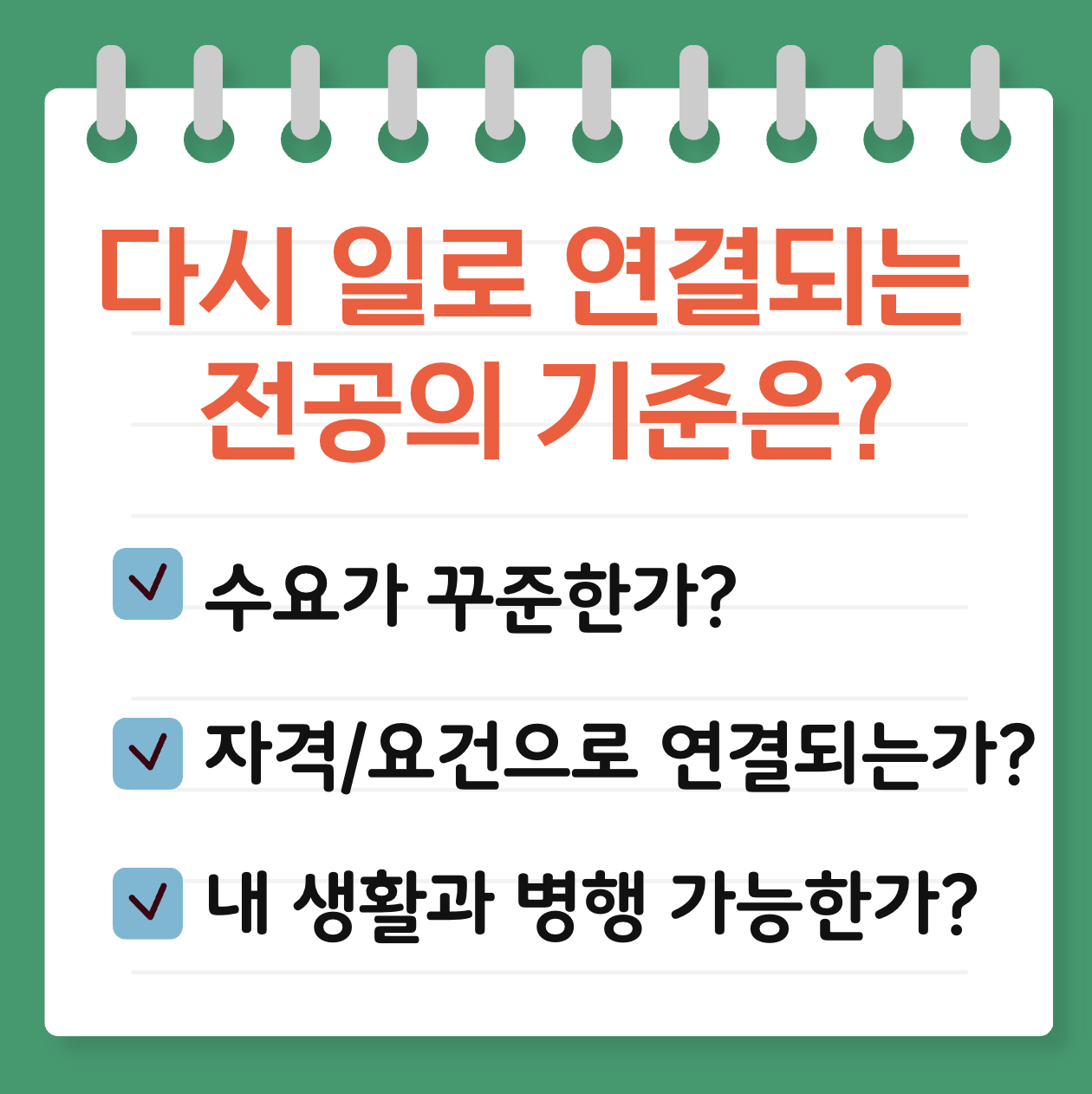 경력단절 이후에 가장 많이 선택되는 전공 3가지는 결국 “다시 일로 연결되는 길이 있는 전공”입니다.
