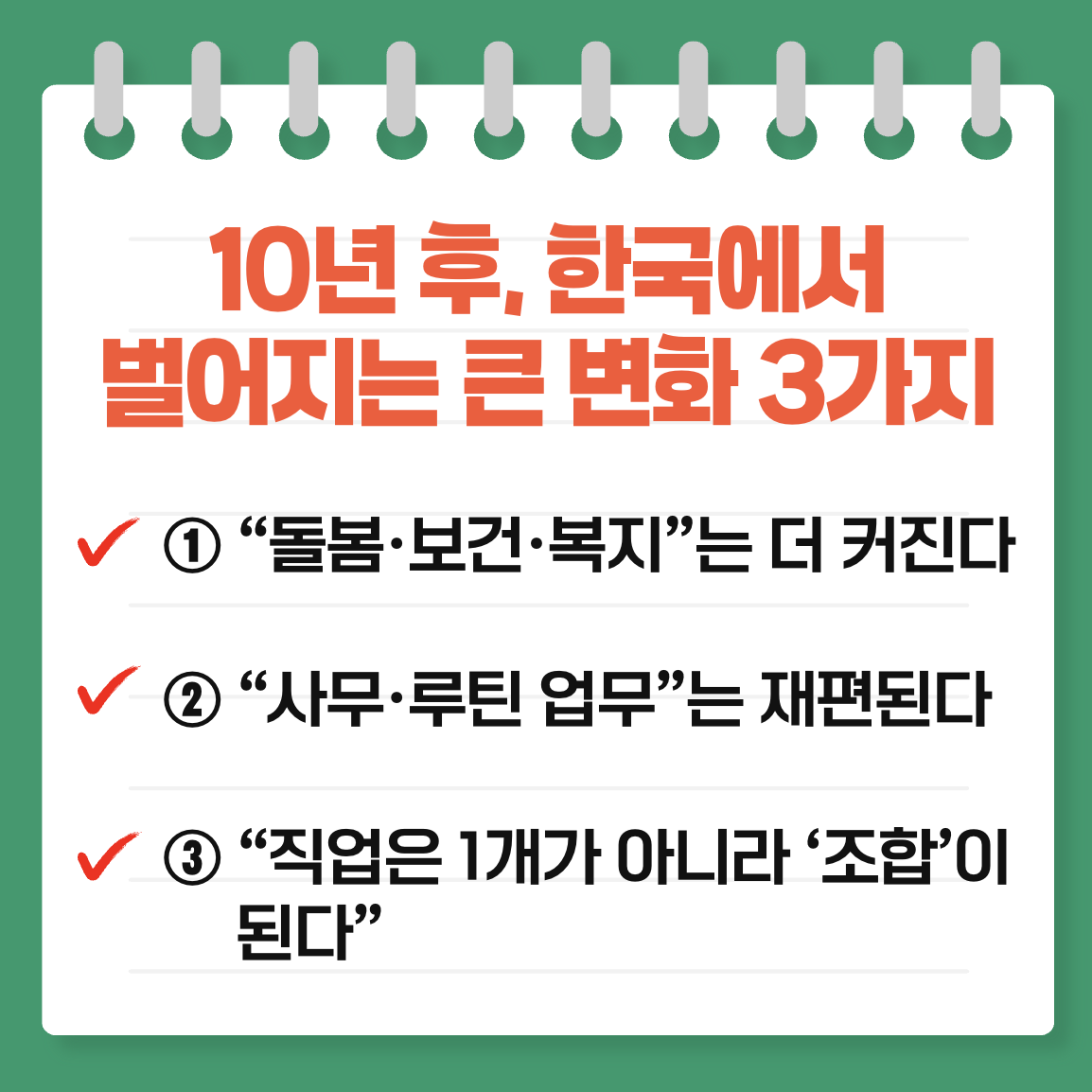→ 어르신 케어, 건강관리, 지역 돌봄, 요양 관련 일은 **더 ‘직업화’**됩니다. (단순 봉사가 아니라 자격·전문성 있는 일자리로)