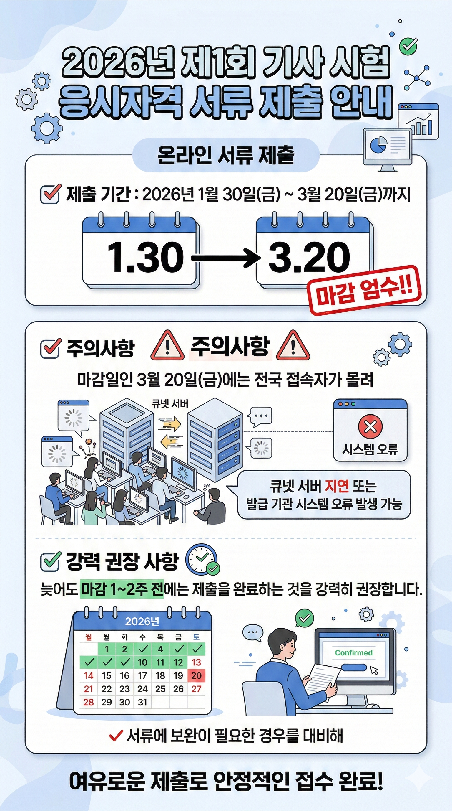 ✔️ 주의사항: 마감일인 3월 20일(금)에는 전국에서 접속자가 몰려 큐넷 서버가 지연되거나, 발급 기관의 시스템 오류가 발생할 수 있습니다. 특히 서류에 보완이 필요한 경우를 대비해 늦어도 마감 1~2주 전에는 제출을 완료하는 것을 강력히 권장합니다.