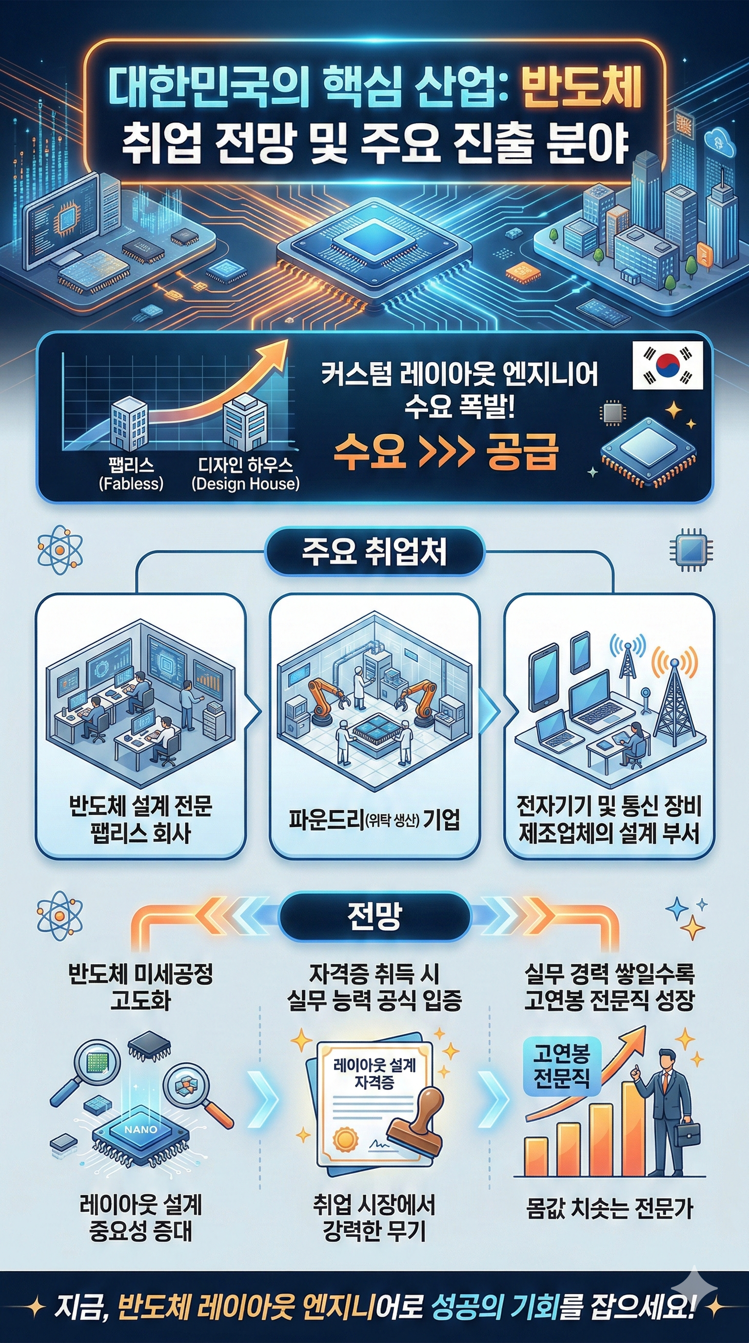✔️ 전망: 반도체 미세공정이 고도화될수록 레이아웃 설계의 중요성은 커집니다. 자격증 취득 시 실무 능력을 공식적으로 입증받아 취업 시장에서 강력한 무기가 되며, 실무 경력이 쌓일수록 몸값이 치솟는 고연봉 전문직으로 성장할 수 있습니다.
