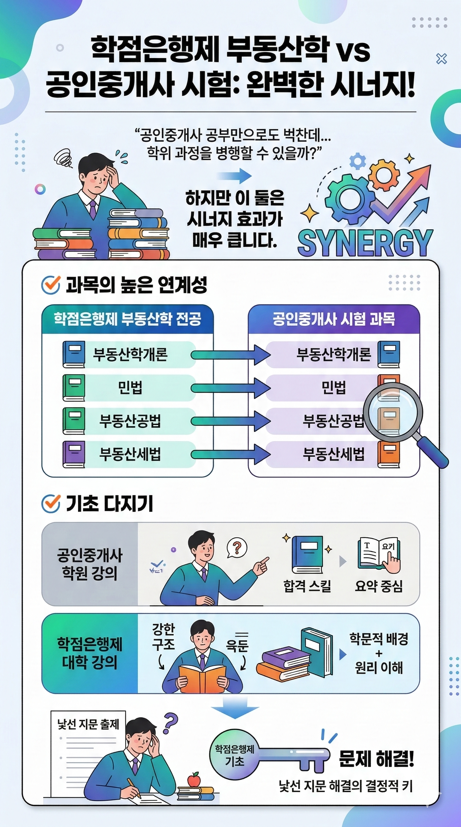 이제는 단순한 자격증 취득을 넘어, 실무적인 전문성을 증명할 수 있는 '부동산학사' 학위를 함께 준비하는 것이 강력한 차별화 전략이 되고 있습니다.
