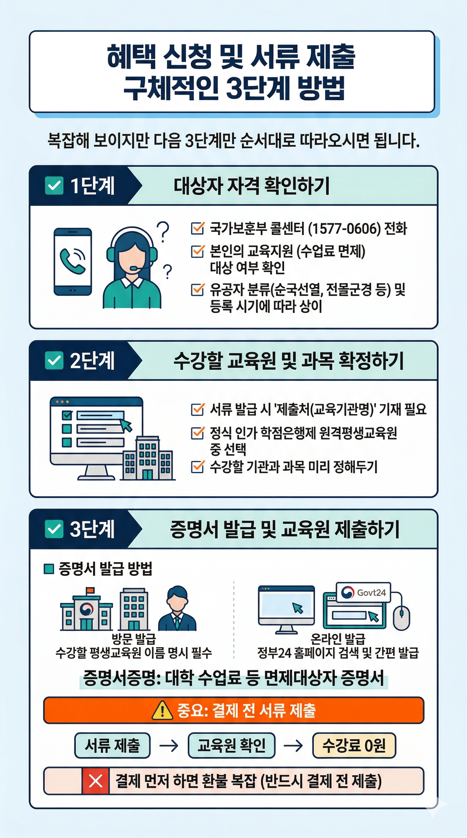가장 먼저 국가보훈부 콜센터(1577-0606)에 전화하여 본인이 교육지원(수업료 면제) 대상자인지 정확하게 확인하세요.